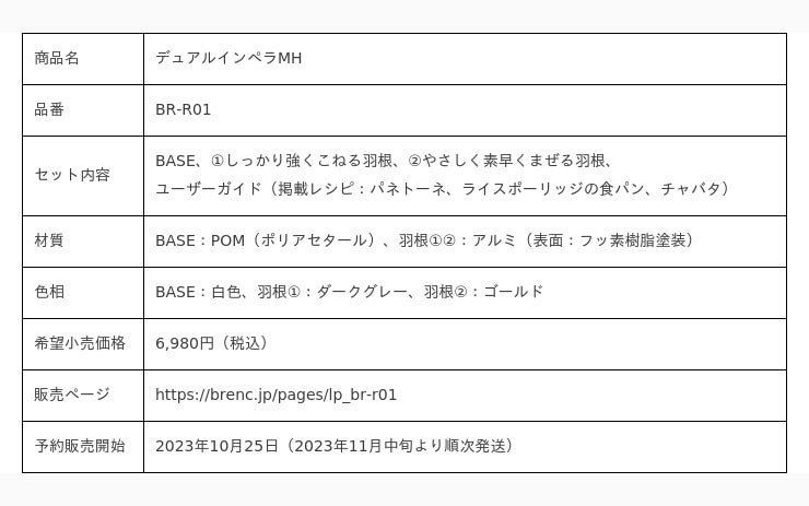 エムケー精工株式会社(本社:長野県千曲市、代表取締役:丸山将一)は、パンづくりを楽しむユーザーに寄り添うブランド『BRENC(ブレンク)』ニーダーのオプション品として、高加水パンの名手である堀田誠シェフ(パン教室「ロティ・オラン」主宰)監修の高加水パン専用羽根「デュアルインペラMH」の予約販売を10月25日(水)から開始します。