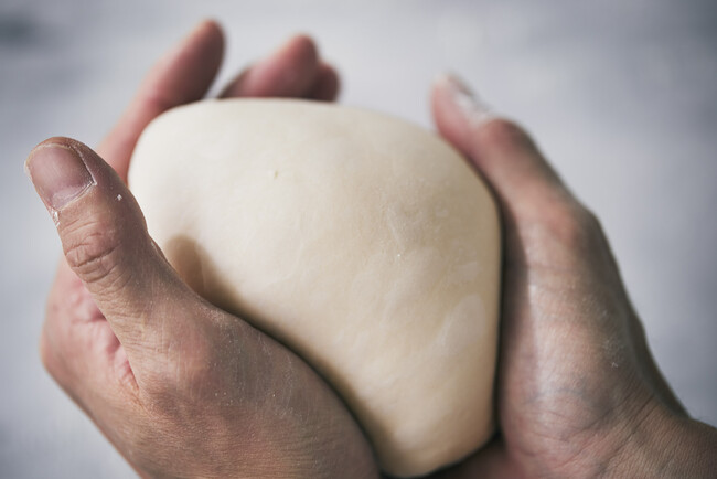 「やさしく素早くまぜる羽根」は、粉と水を素早く均一に混ぜ合わせて、水和※2させるミキシングが可能です。粉が混ざったら、ニーダーの低速(5%)を使ったわずかなパンチ※3でグルテン形成を促し、時間をかけて発酵させます。最小限のミキシングにより小麦粉の酸化を抑えられた生地づくりが可能。小麦粉の風味豊かでもっちりなめらかな食感を目指します。