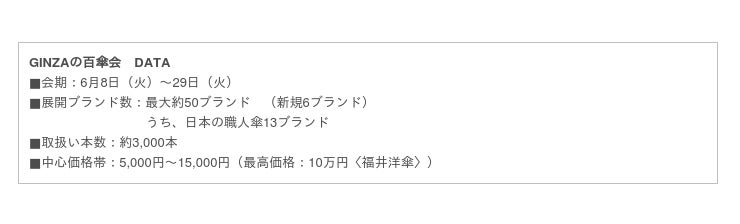 松屋銀座で昭和初期から始まり、半世紀以上続く名物催事「GINZAの百傘会」。今回のテーマは「日本の職人傘」。年々傘の催事が減っている中、コロナによるさらなる打撃を受け、傘の販売機会が減少しています。また、日本の職人の手掛ける傘は手間暇かけて1点ずつ作っていることから、素材やつくりにおいて丈夫で永く使え、修理が出来るものがほとんどです。こういった地域応援や上質な傘を永く使い続けるというサステナブルの観点からも今年は「日本の職人傘」をおすすめし、数多く展開します。
