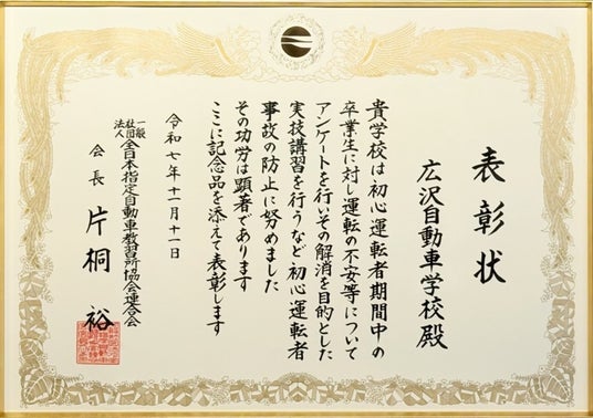 広沢自動車学校では、免許取得そのものをゴールとするのではなく、免許取得後に事故を起こさないことを交通安全教育の最重要指標として位置づけ、免許取得後に直面しやすい運転上のリスクを想定した指導を継続してまいりました。今回の表彰は、そうした教育姿勢と日々の取り組みが評価されたものです。