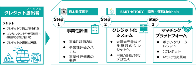 今回、相互の協力のもと、LinkholaのEARTHSTORYの炭素クレジットシステム化と、日本動産鑑定の太陽光発電事業等の事業性評価方法および事業評価システムと連携させることで、持続可能な太陽光発電事業等による炭素クレジットの創出を促進する、ワンストップ型のビジネスモデルが実現します。