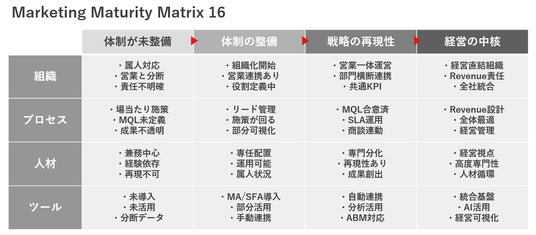 BtoB企業の売上創出のすべてをDXするセールス/マーケティング データリエンジニアリング企業のワンマーケティング株式会社(本社:大阪府大阪市、代表取締役:垣内良太、以下ワンマーケティング)は、2026年3月26日より、BtoBマーケティング組織の成熟度を多角的に評価・診断する独自のフレームワーク「MMM16(Marketing Mutual Matrix 16)」を用いたマーケティング成熟度診断サービスの提供を開始いたします。