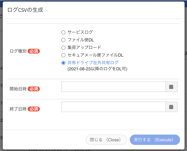 「社外共有レポーター」では、共有ドライブ関連の社外共有ログは全てシステム上に永年保管されるため(※2)、 管理者はいつでも共有ドライブの共有ログを期間指定でダウンロードすることができます。