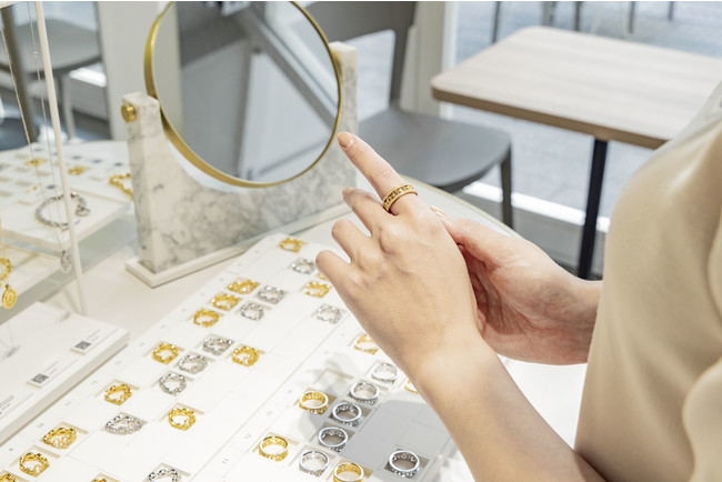 HELICAL CHORD JEWELRY & CAFE は、ジュエリーを「販売」する場所ではなく、ブランドを「体験」いただく場所です。ジュエリーをもっと自由に手に取って試して欲しいという想いから、店内では HELICAL CHORD の全アイテムを、ショーケースではなくオープンにディスプレイ。豊富なサイズバリエーションを展示し、誰でもぴったりのジュエリーが見つかります。