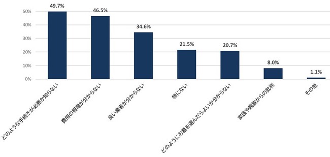 両世代に「改葬・お墓のお引越し」をする際に、懸念することはあるか、また、懸念したことがあるかを聞いたところ、「どのような手続きが必要か知らない」が49.7%でトップ、「費用の相場が分からない」が46.5%で2位という結果になりました。お墓のお引越しを検討しているが、具体的の方法・手段・費用感が分からない人が多くいることがわかる結果となりました。
