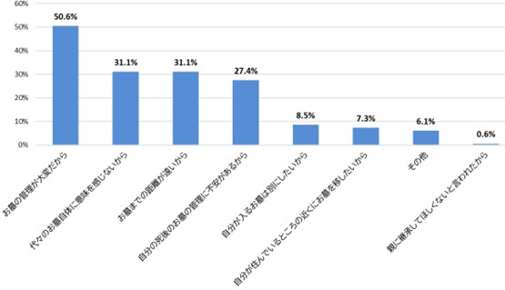 送り出す世代に代々受け継ぐお墓を継承したくないと思う理由を聞いたところ、「お墓の管理が大変だから」が50.6%でトップ、「お墓までの距離が遠いから」が31.1%で2位と現実的な理由がある一方で、「代々のお墓自体に意味を感じないから」と回答する人も31.1%も同率で2位となり、従来のお墓に限らない、新しいお墓・供養意識が根付き始めていることが垣間見える結果となりました。