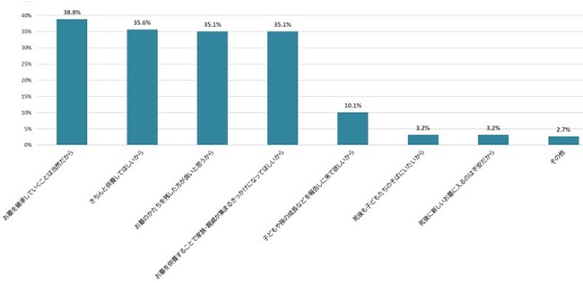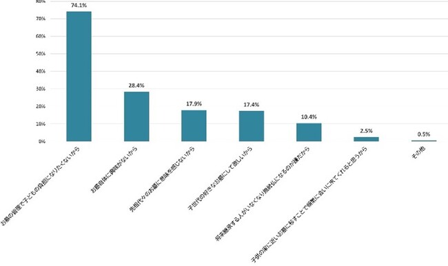 親世代に送り出す世代にお墓を継承してほしいと思わない理由を聞いたところ、「お墓の管理で子どもの負担になりたくないから」が74.1%でトップ。親世代の子どもに対する想いを感じる結果となりました。