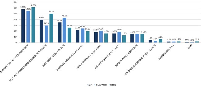 送り出す世代・親世代それぞれに 「改葬・お墓のお引越し」を検討したい・した理由を聞いたところ、「お墓が遠方にあり、行くのに負担がかかるから」が58%でトップの結果となりました。親世代は「自分の子どもや親戚にお墓の管理で負担をかけたくないから」が50.3%と、送り出す世代よりも20%以上高い結果となりました。親世代は子供に負担をかけたくないという心情的な理由が改葬・お墓のお引越しを検討する大きなきっかけになることがわかりました。