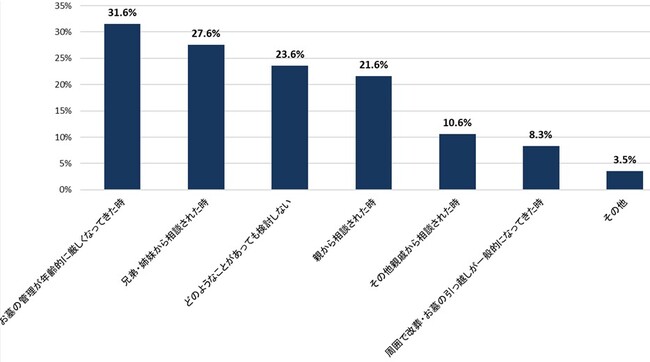 両世代の 「改葬・お墓のお引越し」を検討しない方に、どのようなことがあれば、「改葬・お墓のお引越し」を検討するかを聞いたところ、「お墓の管理が年齢的に厳しくなってきた時」が31.6%でトップ、次いで「兄弟・姉妹から相談された時」が27.6%という結果になりました。管理が厳しくなってきたという現実的な理由に加え、共にお墓を管理する兄弟・姉妹の意見が大きく影響をするという結果がわかりました。