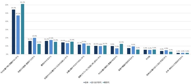 送り出す世代・親世代それぞれに 「改葬・お墓のお引越し」を検討したくない理由を聞いたところ、親世代・送り出す世代全体で「今のお墓で特に問題がないから」が54.3%でトップ、次いで「手続きが面倒・面倒そうだから」、「費用がかかるから」がそれぞれ16.2%で続く結果となりました。手続き面や費用面などが制限になり検討しない人たちが一定数いることも分かりました。