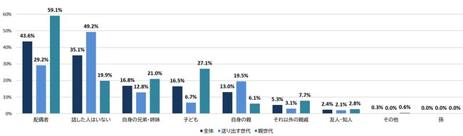 送り出す世代・親世代それぞれに「改葬・お墓のお引越し」の話をどなたかとしたことがあるかを聞いたところ、送り出す世代は「話した人はいない」という回答が49.2%だったのに対し、親世代は19.9%と30%近い差が表れ、親世代は「お墓のお引越し・改葬」について多くの人が周りと話したことがある結果となりました。「配偶者」を話す相手と回答した人は送り出す世代は29.2%、親世代は59.1%とこちらも約30%の差が表れました。親世代と送り出す世代で行動の差が顕著に表れる結果となりました。特に親世代は自分の子供たちに負担をかけたくないという想いが強いと予想されます。