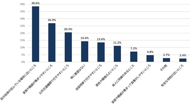 両世代にどのような場所に「改葬・お墓のお引越し」をしたいと思うかを聞いたところ、「自分自身の住んでいる場所に近いところ」が38.6%でトップ、「家族や親戚が集まりやすいところ」が26.9%で2位となり、先祖を近くに感じたいという想いが推察される結果となりました。続いて「公共交通機関で行きやすいところ」が20.5%、「自家用車で行きやすいところ」が13.6%と、交通の利便性も重要視され、遠い場所へ行くという現状の供養習慣にストレスを感じている人が一定数いることが類推される結果となりました。