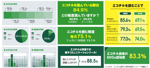 その結果、エコチルを読むことで「環境意識に良い変化があった(保護者85.6%・お子様69.1%)」、「環境に配慮する行動に良い変化があった(保護者79.3%・お子様69.5%)」、「SDGsに関心を持つようになった(保護者77%・お子様74%)」という効果が出ており、このような成果を全国に広げていきたいと考えております。