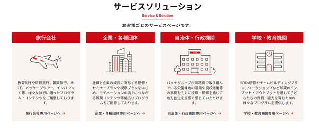 サイトをご利用の団体担当者のマーケテイング情報を活用した興味のあるコンテンツの提供や、サイト閲覧履歴の活用により、より快適な来訪体験をWebサイト上から実現いたします。提供コンテンツを紙ベースではなく、オンライン上で展開することで、お客様の検討期間の最適化の実現や気軽なお問い合わせを創出することを今後の展開として見通しています。
