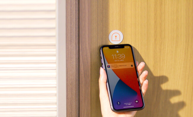 アプリを立ち上げなくても、壁に両面テープでNFC タグを貼り付ければ、スマホをかざすだけで簡単に解施錠が可能になります。