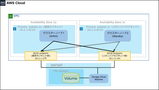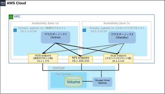 図1 Linux環境での「LifeKeeper」「Amazon FSx for NetApp ONTAP」によるHAクラスター構成