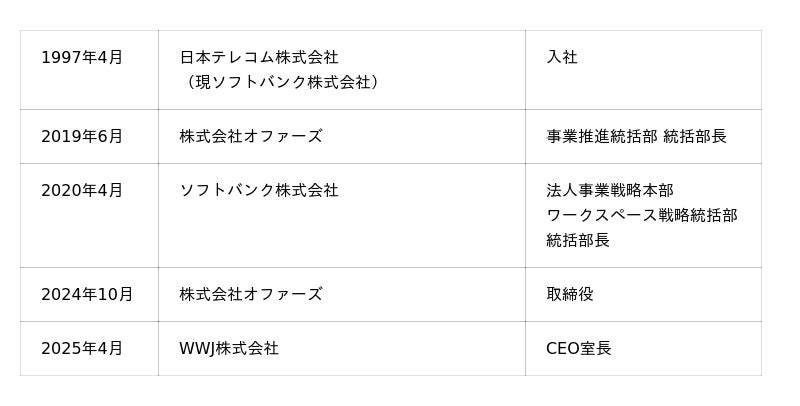 黒澤は、ソフトバンク株式会社 法人事業戦略本部 ワークスペース戦略統括部 統括部長や、「WeWork Japan」を提供するWWJ株式会社のCEO室長を歴任するなど、エンタープライズおよびスモールビジネスにおけるオフィス戦略やDXに関する豊富な知識・経験を有しています。