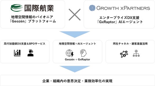 国際航業の「Geozen」と、GxPの独自AIエージェント構築サービス「GxRaptor」とを組み合わせ、地理空間情報を活用したAIエージェントサービスを企画・提供し、中長期的な新規サービスおよび収益機会の創出を目指します。