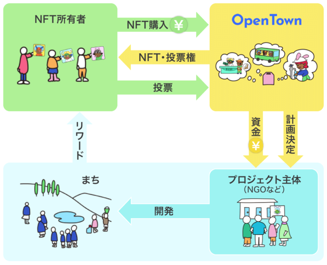 奇兵隊では、社会貢献分野に「Web3」の技術を持ち込んだ、クラウドファンディングサービス「Open Town(オープンタウン)」を提供することで、世界各国で自律したまちづくりを実現することを目指しています。プロジェクト主体は、その地域をモチーフにしたNFTアートを制作し、全世界に販売して、その売上を活用して、まちづくりを進めていきます。NFTアートの購入者には投票権が付与され、まちづくりの方向性はそれらのNFT購入者による投票によって、地域住民のニーズを十分に考慮した上で決定されます。