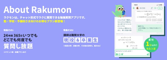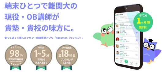 勉強質問アプリRakumon企業様向けプラン(以下ラクモン)は、塾や学校の生徒様が難関大学を合格した先生にオンラインで質問できるサービスです。導入費・固定費は不要で、繁忙期のスポット利用も可能です。