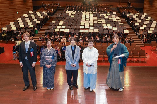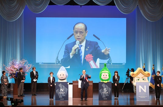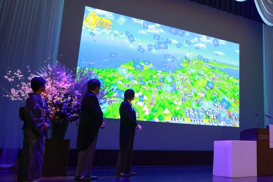 会場には岡山市の大森雅夫市長と岡山県内のご当地キャラクターである「ミコロ」「ハコロ」(岡山市)、「シラカベーノ」(倉敷市)が駆けつけ、各キャラクターには岡山県倉敷市の名産品・デニムで作られた卒業証書・修了証が贈られたほか、人気ゲームシリーズ「桃太郎電鉄」の車両が卒業式会場より出発し全国各地の卒業生に卒業証書・修了証を届けるスペシャル映像が公開されるなど、岡山県ゆかりのプログラムで卒業生の門出を祝いました。