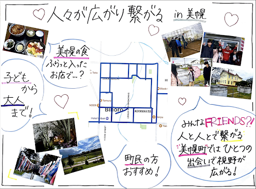美幌の「美」という文字をGPSで表した。このチームは、唯一美幌町をネガティブな言葉で表現した。人に焦点を当て、その人の特徴を元にニックネームを付け、その方々が話してくださった内容をまとめた。その共通点から見えてきたのが「この街を愛していない」ということ。チームで話し合った結果、愛していない理由は「娯楽が少ないから」という結論に。また、シャッター街が目立つため、その場所に娯楽を増やすことで住人が街を愛することにつながるのではないか、という提案まで発表した。
