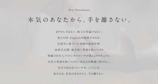 90 Englishは、短期集中や詰め込み型の学習だけではなく、無理なく続けられる「持続可能な英語学習」を追求した英語コーチングスクールです。採用率約3%の日本人バイリンガルコーチがあなたの隣で伴走し、徹底的に継続できる環境を提供します。