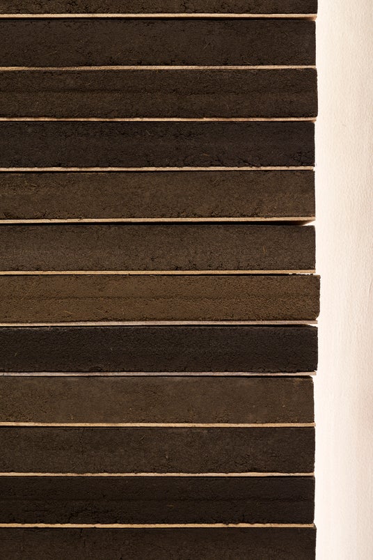 「立体木摺土壁」は建設発生土や藁スサ、おがくずといった自然由来の素材を用いながら、土と木を積層した壁です。古来より世界中で用いられてきた、日干し煉瓦を応用して、内装材として淺沼組で独自開発しました。土壁を自立可能な構造として安定化・軽量化し、短時間での施工を可能にしました。自然素材のみの使用により、低炭素性(建設時CO2排出量抑制)、炭素貯留性(土と木に炭素を貯留)、資源循環性(土と木の分離による再生利用)、吸放湿性(空気環境改善)に優れています。今後、本構法がより幅広く活用されることを目指し、耐火大臣認定取得も視野に、研究開発を進めてまいります。(特許第7723873号)