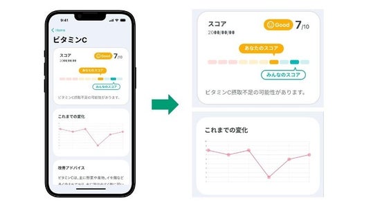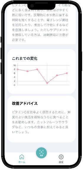 また、検査結果はアプリ内に保存されるため、過去の結果も表示可能です。月に1回、週に1回など、定期的に検査をすることで、これまでの変化を見ることができます。普段から実践している運動や摂取しているサプリメントの効果の確認など、さまざまなシーンでの活用が可能です。