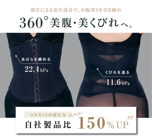 コルセットは苦しそう、私には必要ない、暑くてムレそうなど、お客様からのイメージを変えるべく、「ととのうコルセット」は緻密な着圧設計と通気性の良い素材で「あばらを締めて、360°美腹・美くびれ」を実現しました。