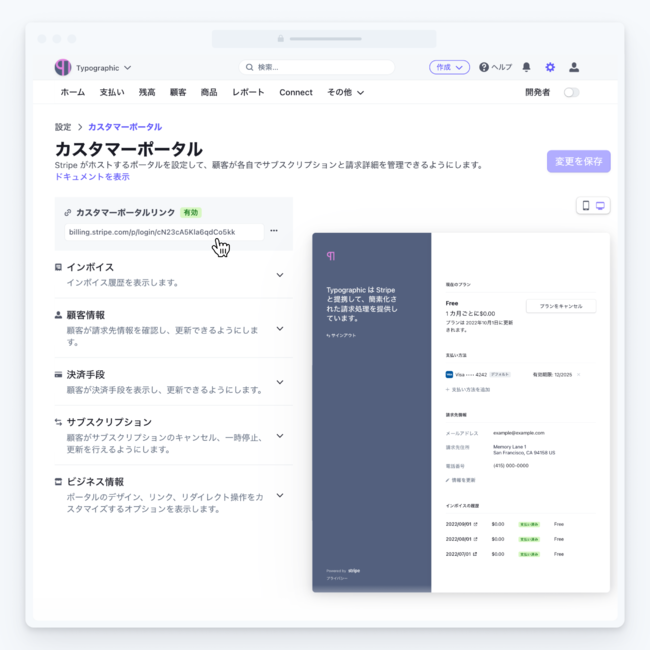お客様のアカウント情報を一元管理できる「カスタマーポータル」を、ノーコードでご利用頂けるようになりました。日本でもご要望の多かった機能で、お客様に URL リンクを提供するだけで、お客様側でサブスクリプション (サブスク) の更新、一時停止やキャンセル、決済手段の更新、請求書 (インボイス) 履歴の表示などができるようになりできます。ノーコード化することにより、お客様への連絡、新しいカード情報の登録、カード情報とサブスクリプションの紐付けや契約の管理などの隠れた負担・コストを軽減します。