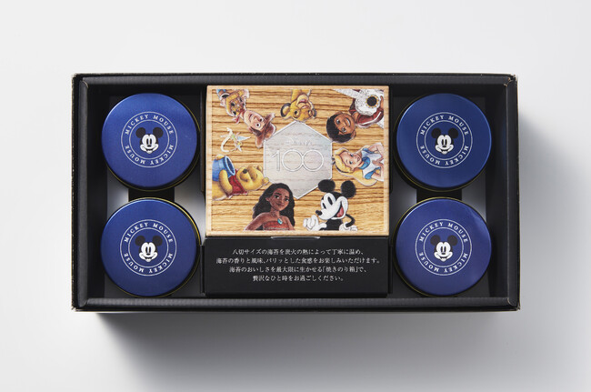「焼きのり箱」の蓋にはディズニー創立100周年限定デザインを施し、セットの海苔は弊社170年の歴史と伝統の技によって仕上げた焼海苔となっております。慣れ親しんだ海苔を、さらにおいしく食べていただくことができる商品です。