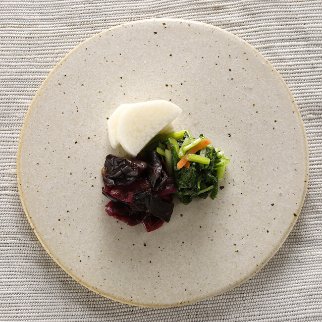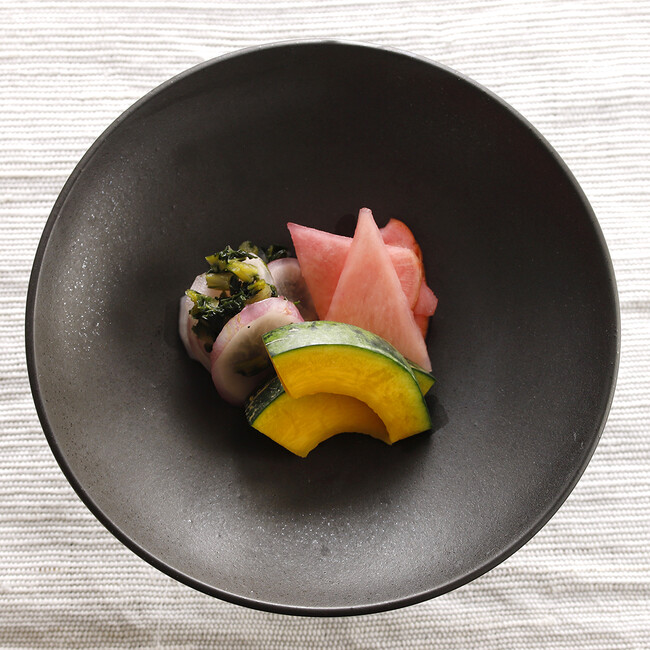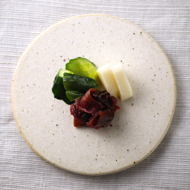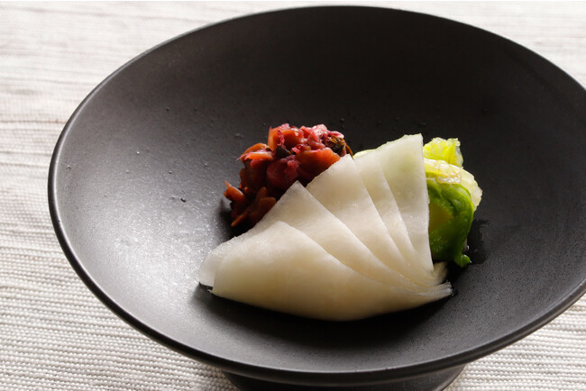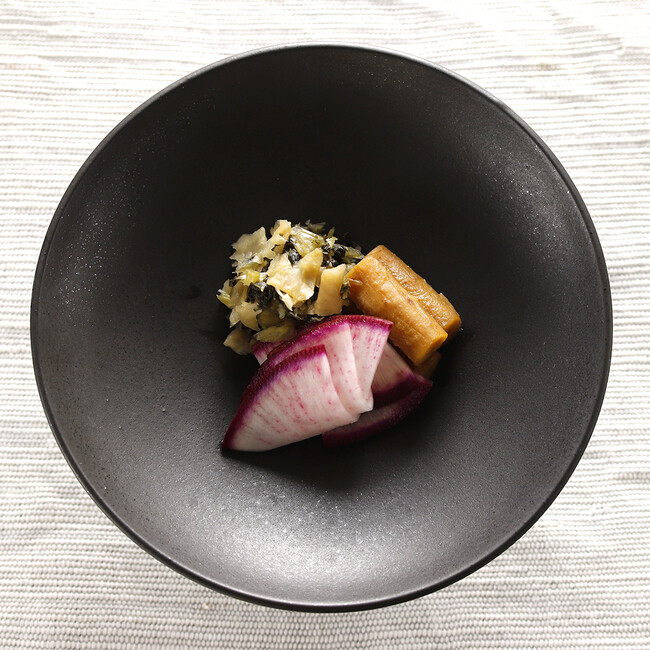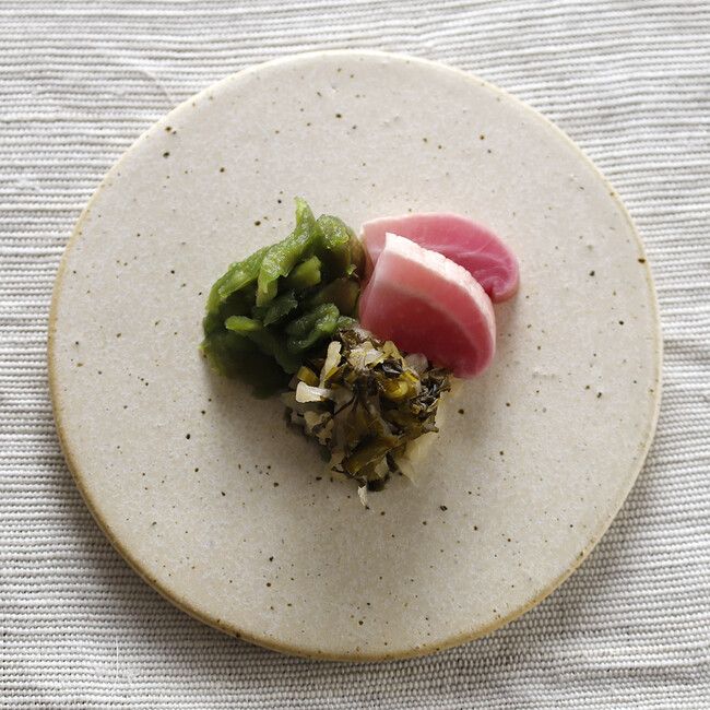 旬に採った小かぶらを糠床でじっくり熟成させ、青紫蘇、山椒の実、生姜、茗荷を加えてあっさりと仕上げています。