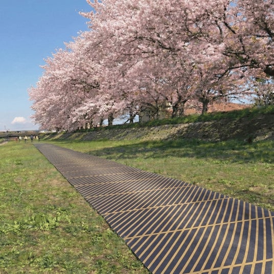 製紙メーカーの技術が詰まった20メートルの長い一筋が、春の川辺をどう彩るのか。自然と一体になる心地よさを、ぜひ現地でご体感ください。
