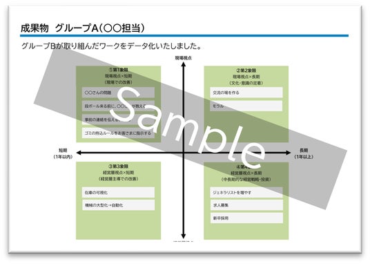 業務フローや職場環境、組織体制等を振り返り、理想と現実のギャップを明確化。優先度が高い課題に対し、実現可能な施策をグループディスカッションで深掘りしました。