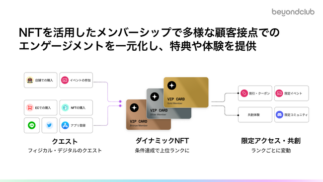 顧客獲得コストが高くなり、LTV(顧客生涯価値)を上げるためのコミュニティ作りや双方向的なロイヤルティプログラムが重要になる中で、beyondClubでは、ブランドやクリエイターがノーコードでメンバーシップNFTやNFT保有者への体験を付与できるようにすることで、ファンとのより強い関係を築くことを支援します。