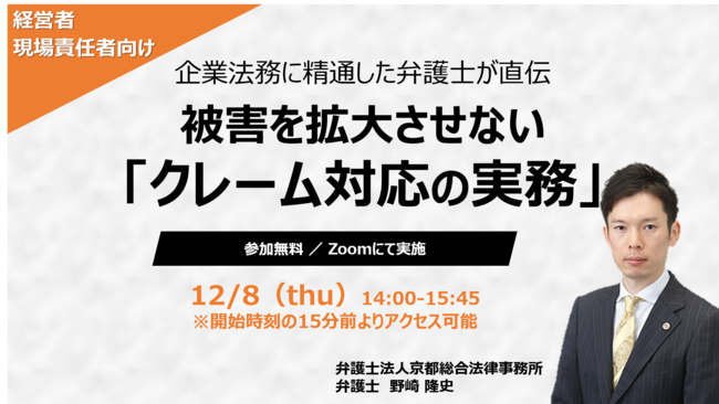 企業法務分野に精通した弁護士法人京都総合法律事務所(所在地:京都府中京区)は、「被害を拡大させない“クレーム対応の実務”」をテーマにしたオンラインセミナーを2022年12月8日(木)に無料開催いたします。