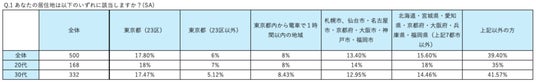 回答の選択肢として、「東京都23区」「政令指定都市」「その他主要都市」「その他の地域」の4つを設けました。運転免許の保有状況は、地域によって異なる可能性があると考え、都市部と地方における運転免許の必要性の違いや、公共交通機関の利用状況などを考慮し、これらの選択肢を設定しています。全体では、東京都23区に居住している回答者が最も多く17.8%、上記以外の地域が39.4%となっています。