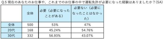全体の回答者500人のうち、53%が「必要(必要になったことがある)」、47%が「必要ない(必要になったことはない)」と回答しました。つまり、現在の仕事や過去の仕事で運転免許が必要になった経験を持つ人が半数以上を占めています。年代別に見ると、20代では運転免許が「必要ない」と回答した人が半数以上を占めていますが、30代では「必要」と回答した人が半数以上を占めています。