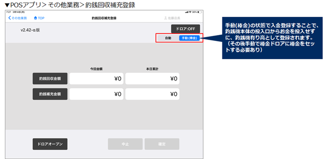 自動釣銭機連携時の出金機能で金種を指定して出金できるようになりました。両替時や硬貨がFull状態になった際に釣銭機本体を直接操作しなくても対応できます。