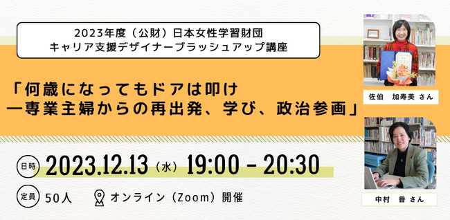 人生100年時代を迎え、年齢にかかわらず必要な能力やスキルを身につけ、新たなキャリアを築く人たちが増えています。本講座では、専業主婦を経て、60 歳で市議会議員になるまでの出発・再出発を綴ったレポート「何歳になってもドアは叩け」で、第6回日本女性学習財団未来大賞を受賞した佐伯加寿美さんに、レポートをもとにした体験談をお話いただき、生涯学習論を専門とする中村香さん(玉川大学教授)とのトークセッションを行います。女性のキャリア形成支援に役立つヒントを得られる講座です。オンライン(Zoom)開催、見逃し配信もありますので、ぜひご参加ください!