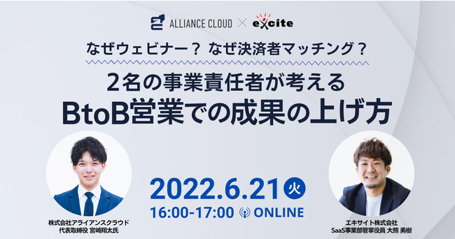 決裁者アポ獲得支援SaaS「アポレル」を運営する株式会社アライアンスクラウド(本社:東京都目黒区、代表取締役:宮崎 翔太 以下「アライアンスクラウド」)とエキサイト株式会社(本社:東京都港区、代表取締役社長:西條晋一、以下「エキサイト」)は、B2B営業での成果の上げ方に関して「成約見込みの高いホットリードの獲得手法」の観点からアライアンスクラウドとエキサイトの事業責任者が対談する、参加費無料の営業・マーケティング責任者向けウェビナーを6月21日(火)16時より開催することをお知らせします。