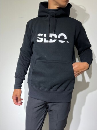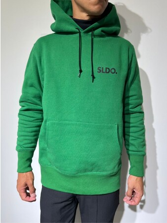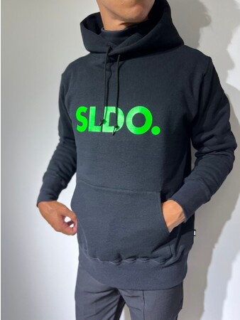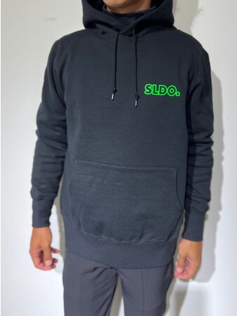 胸元にはネオングリーンのエッジングが鮮やかなロゴや遊び心のあるホワイトロゴを、フーディーの紐先やサイドにホワイトのSLDO.ロゴを配置。