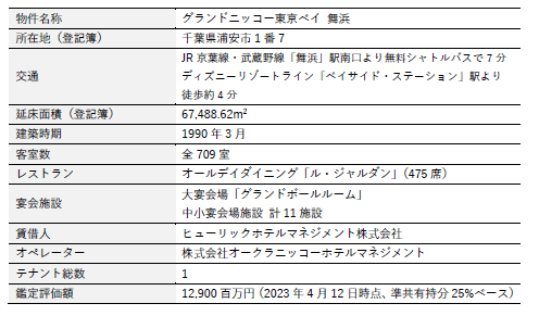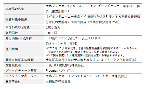 この度、その第6弾として、資産規模 129億円(準共有持分 25%ベース)の千葉県舞浜にあるディズニーリゾートオフィシャルホテルを裏付け資産とし、発行総額が約 58億円となる不動産 STOによる資金調達を完了し、「ケネディク ス・リアルティ・トークン グランドニッコー東京ベイ 舞浜(譲渡制限付)(以下「本 ST」)」の運用を開始したことをお知らせいたします。