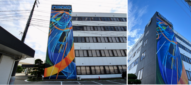 アスファルトプラントやコンクリートプラントの製造販売を手掛ける日工株式会社(本社:兵庫県明石市、代表取締役社長:辻 勝 証券コード:6306 以下、「当社」)は、ミューラル(壁画)のプロデュース事業を展開するWALL SHARE株式会社(本社:大阪府大阪市 代表:川添孝信、以下「WALL SHARE」)と共同で、土木用プラントをミューラル(壁画)で彩る「プラントアートプロジェクト」を展開しています。この度は、その第一弾の作品として、日工本社ビルの外壁に巨大ミューラル(壁画)が誕生しました。