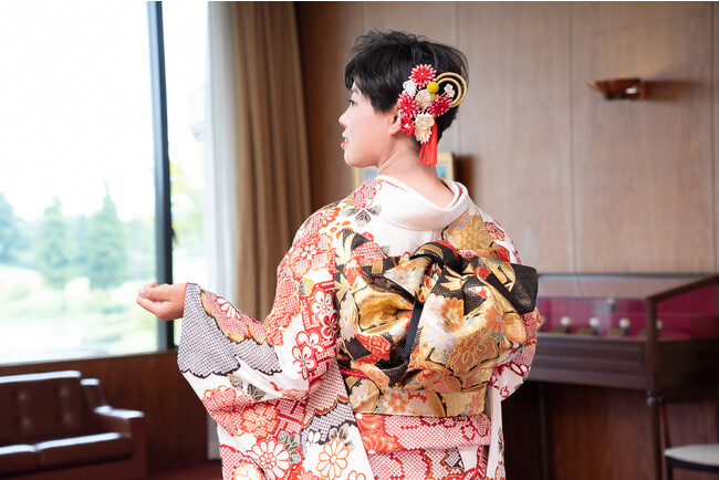 この振袖を選んだ理由は、伝統的な色柄に魅力を感じたからだそうで、「実際に着てみたら、普段の自分とは違う姿にとても驚きました。まだ気温の高い日だったのでちょっと暑かったですが、楽しかったです」とコメントされていました。