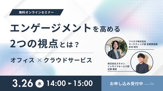 オフィス移転やリニューアルをはじめとする「働く場」づくりをトータルで提案・コーディネートするリリカラ株式会社(東京都新宿区、代表取締役社長執行役員 山田 俊之)のスペースソリューション事業部は、エンゲージメントプラットフォーム「TUNAG」を開発・提供する株式会社スタメン(東京本社:東京都千代田区、代表取締役 大西 泰平)との共催オンラインセミナー「エンゲージメントを高める2つの視点とは?オフィス×クラウドサービス」を3月26日(水)に開催いたします。
