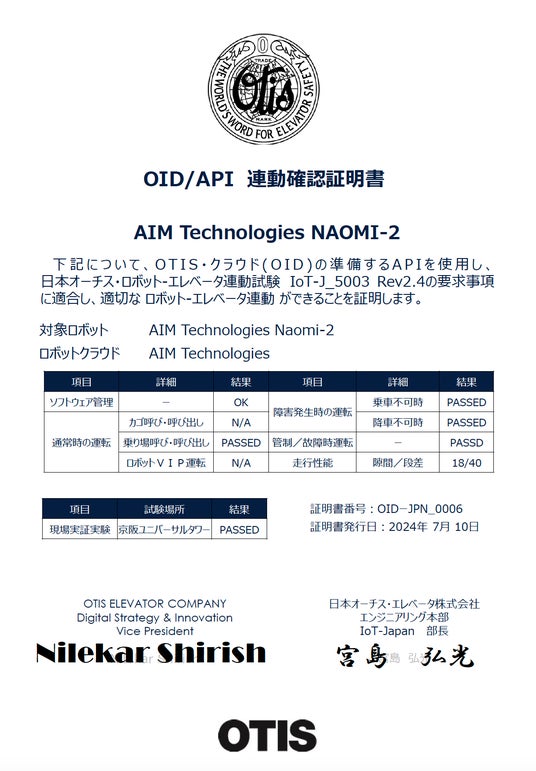この証明書はOTIS クラウド(以下OIDと言う)とロボットとが通常運転に加えて障害発生時、管制時/故障時運転においても問題なく連動する試験をパスしたことを証明しております。
