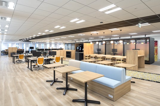 新オフィスでは、1フロアに集約された開放感あふれる執務エリアを、「集中エリア」「ワーキングエリア」「ミーティングエリア」「コミュニケーションエリア」と4つにエリアに分けて、社員が自由に働く場所を選び、一人ひとりが最大限のパフォーマンスを発揮できるよう設計しました。また、執務エリア中央に共用通路を広げることで、部署やチームの枠を越えた社員同士の偶発的な出会いと共創を起こりやすくするようなデザインにしました。さらに、サカタインクスグループ共用のラウンジ「COLORS CAFE」を設置し、グループ社員同士の積極的なコミュニケーション促進とアイデア交換によるシナジー効果創出とともに、グループ全体のエンゲージメント向上と生産性の最大化を目指しています。