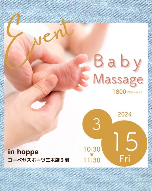 特定非営利活動法人ほっぺ(代表:大森 奈津子)は親子向けイベントとして、2024年3月15日(金)にhoppe(コーベヤスポーツ三木店3階)にて、ベビーマッサージ体験ができる「Baby Massage in hoppe」を開催いたします。
